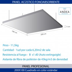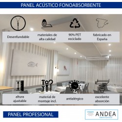 Panel de grandes dimensiones con estructura interior.   Formado por un aislante o varios insertados en un armazón de chapa fina.  Dicho conjunto va envuelto con un forro en tejido de poliéster de tacto aterciopelado en colores varios según nuestro muestrario de telas.  Incluye herrajes de colgar al techo que van anclada al armazón del panel.  Son desenfundables y los forros se pueden lavar.