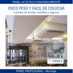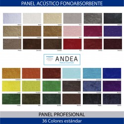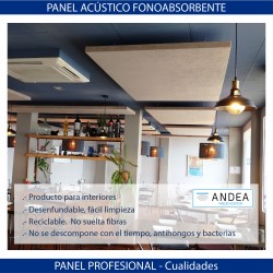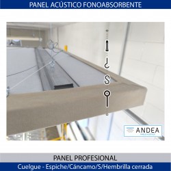 Panel de grandes dimensiones con estructura interior.   Formado por un aislante o varios insertados en un armazón de chapa fina.  Dicho conjunto va envuelto con un forro en tejido de poliéster de tacto aterciopelado en colores varios según nuestro muestrario de telas.  Incluye herrajes de colgar al techo que van anclada al armazón del panel.  Son desenfundables y los forros se pueden lavar.