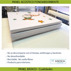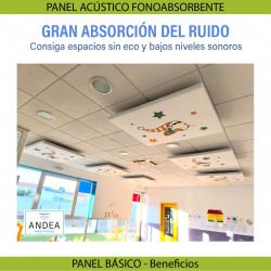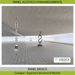 Panel formado por un aislante envuelto en tejido de poliéster técnico liso de tacto suave, y con unos muelles espirales en su cara superior por donde se suspenderán del techo. Incluye herrajes de colgar al techo. La tela podrá ser impresa con una imagen (dibujo o fotografía), a escoger por el cliente o un color especial de nuestra pantonera.