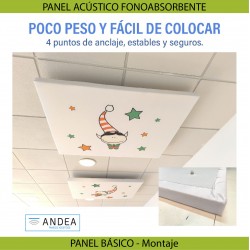Panel formado por un aislante envuelto en tejido de poliéster técnico liso de tacto suave, y con unos muelles espirales en su cara superior por donde se suspenderán del techo. Incluye herrajes de colgar al techo. La tela podrá ser impresa con una imagen (dibujo o fotografía), a escoger por el cliente o un color especial de nuestra pantonera.