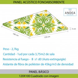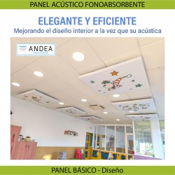 Panel formado por un aislante envuelto en tejido de poliéster técnico liso de tacto suave, y con unos muelles espirales en su cara superior por donde se suspenderán del techo. Incluye herrajes de colgar al techo. La tela podrá ser impresa con una imagen (dibujo o fotografía), a escoger por el cliente o un color especial de nuestra pantonera.