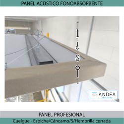 Panel tipo cuadro de grandes dimensiones con estructura interior. Formado por varios aislantes insertados en un armazón de chapa fina. Dicho conjunto va envuelto con un tejido de poliéster técnico liso de tacto suave. Dicha tela podrá ser impresa con una imagen o foto a escoger por el cliente o un color especial de nuestra pantonera. Incluye herrajes de colgar al techo que van anclados al armazón del panel. Este panel no es desenfundable.