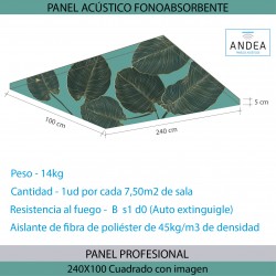 Panel tipo cuadro de grandes dimensiones con estructura interior. Formado por varios aislantes insertados en un armazón de chapa fina. Dicho conjunto va envuelto con un tejido de poliéster técnico liso de tacto suave. Dicha tela podrá ser impresa con una imagen o foto a escoger por el cliente o un color especial de nuestra pantonera. Incluye herrajes de colgar al techo que van anclados al armazón del panel. Este panel no es desenfundable.