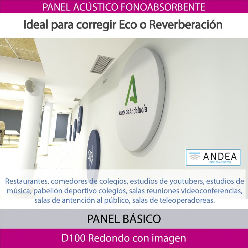 Panel circular, formado por un aislante redondo envuelto en tejido de poliéster técnico liso de tacto suave, y con unos muelles espirales en su cara superior por donde se suspenderán del techo. Incluye herrajes de colgar al techo. La tela podrá ser impresa con una imagen (dibujo o fotografía), a escoger por el cliente o un color especial de nuestra pantonera.